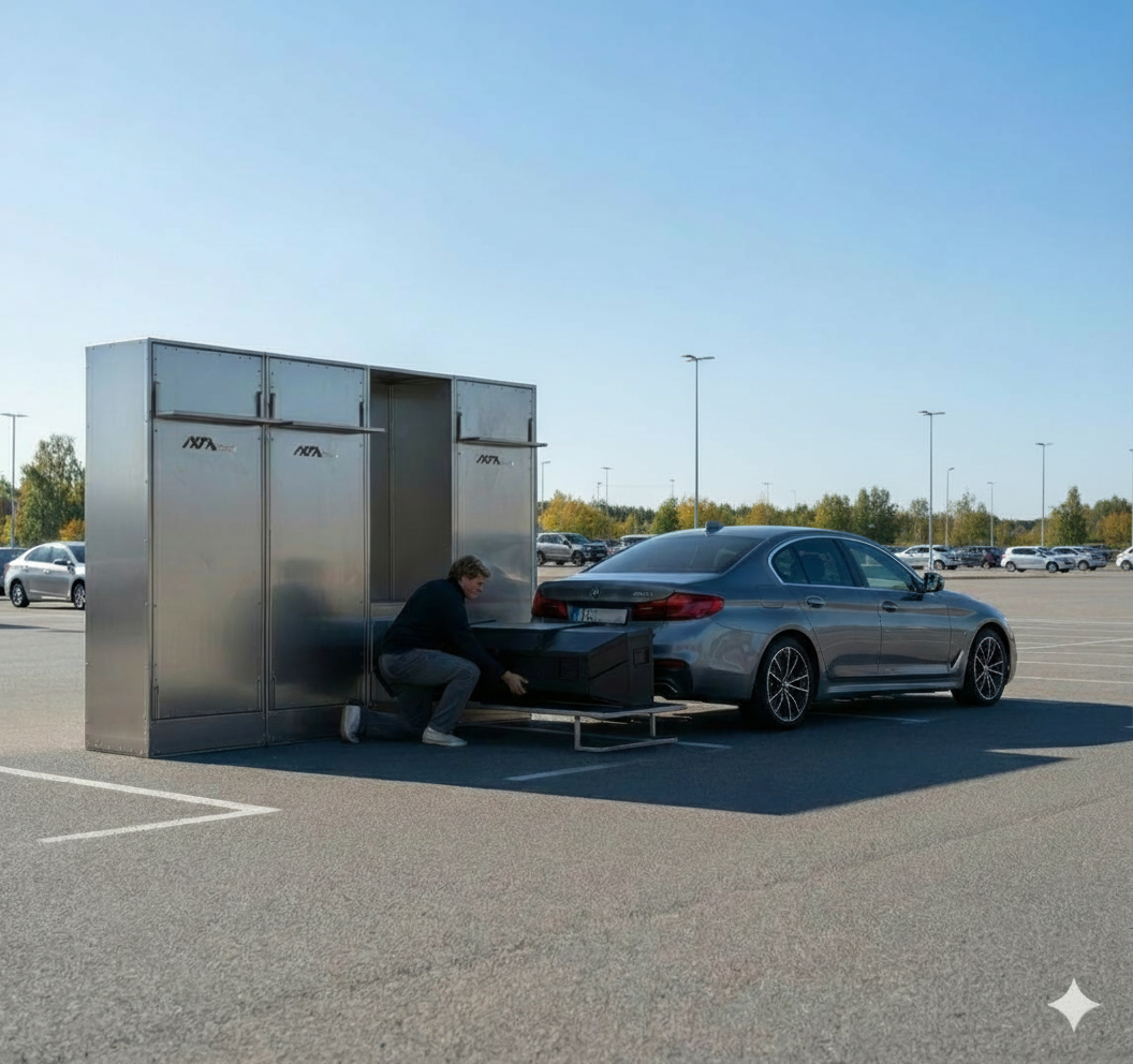 Design a rugged, unmanned rental stand and an integrated digital booking system that allows a single user to mount a heavy cargo box without assistance.